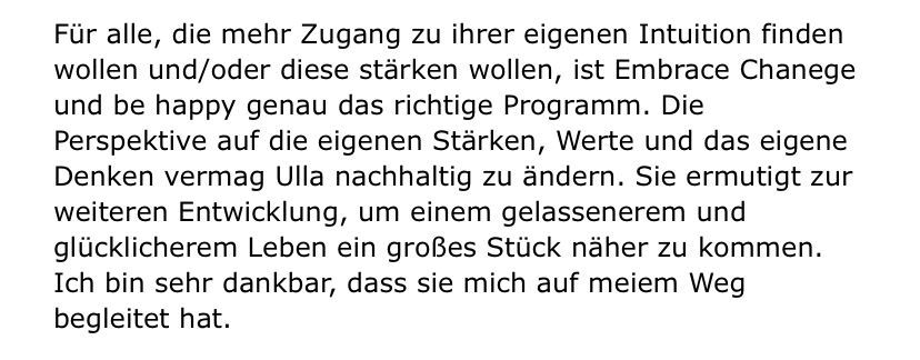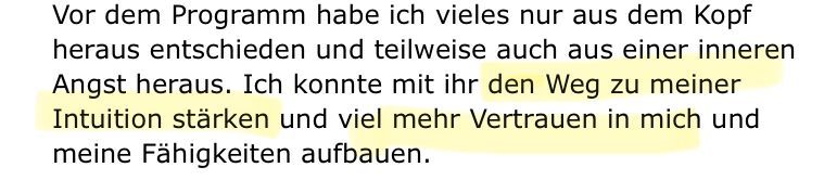 Du findest wieder Zugang zu deiner inneren Stimme und lernst, ihr zu vertrauen. Du erlaubst dir deinen Weg zu gehen - auch wenn er nicht dem entspricht, was andere erwarten. Du spürst, was richtig ist, auch wenn Dein Verstand Dir etwas anderes erzählen will. So gehst Du mutig den Weg zu dem Leben, das Du Dir tief im Herzen wünschst.